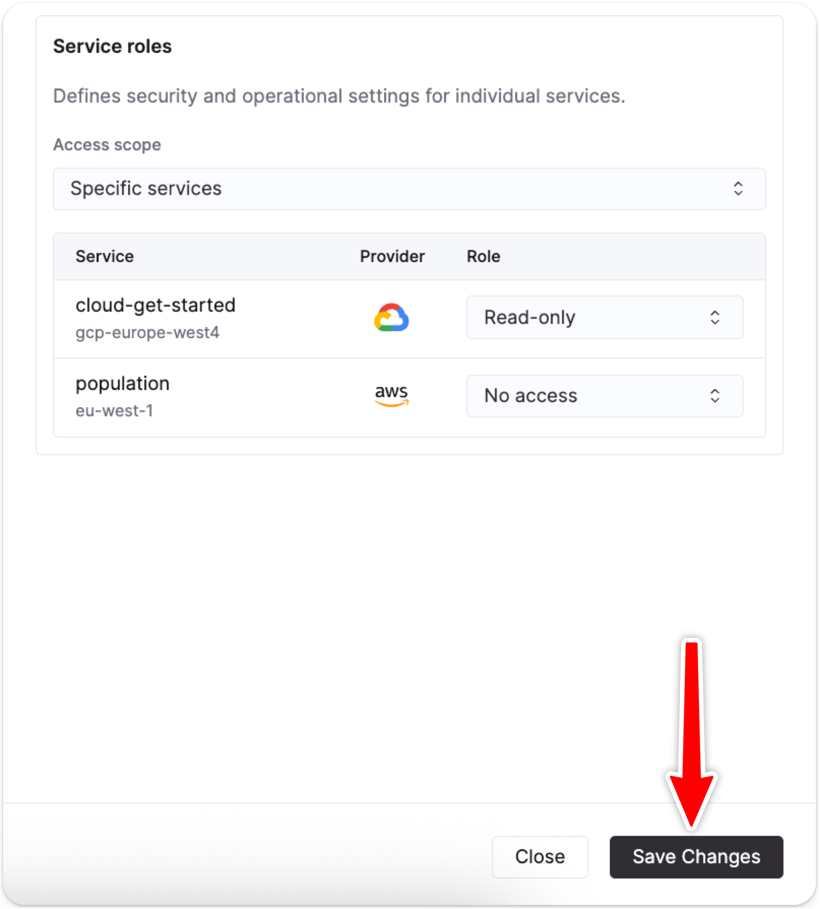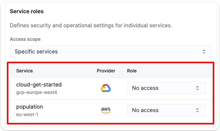 선택된 사용자의 서비스 역할(service role)의 액세스 범위를 조정하려면 드롭다운 메뉴에서 항목을 선택합니다. Specific services를 선택하면 서비스별로 사용자의 역할을 제어할 수 있습니다.